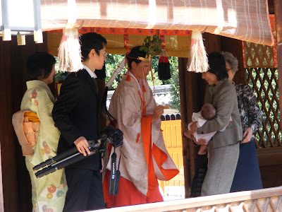 We are here at to Kenkun jinja a quiet hill top shrine just to the south of Tani House, but have also visited Yoshida and Yasaka shrines and the very picturesque Shimogamo shrine set in a park between the two forks of the river which was literally pulsating with a series of wedding ceremonies, and 'christenings' of infants demonstrating the relationship between Shinto and the rights of passage of life in birth and marriage, and a ceremony between a Shinto priest and his partner wildly dressed up like a woman in a traditional Japanese medieval play almost unable to move for the flowing bulky garments, requiring two attendants to get her into her clogs to move to the next shrine.